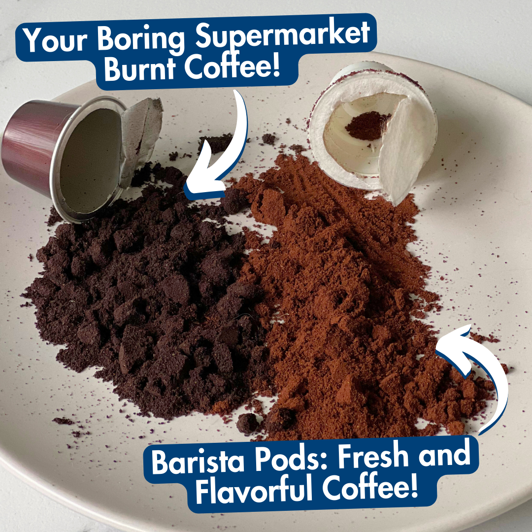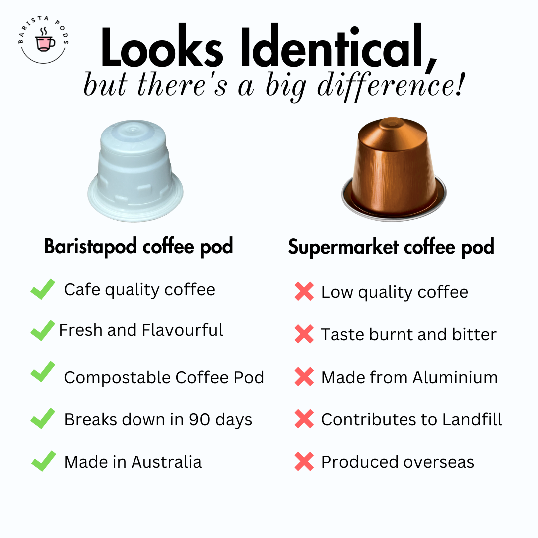 If you are you tired of sifting through grocery store shelves, wondering which coffee pod to pick next? Here's a secret: many of them are filled with low-quality, over-roasted, burnt coffee. Because most big coffee pod manufacturers prioritise maximising profits, often sticking to aluminium pods despite compostable and biodegradable options being available for years. At Barista Pods, we've made it our mission to fix this issue. We believe everyone deserves to enjoy good quality coffee roasted right here in Australia and packed with premium beans. You shouldn't have to spend $5 at a café or thousands of dollars on fancy espresso machines just to have a great-tasting cup of coffee. By switching to Barista Pods, you can enjoy the same quality coffee beans just like your favourite cafe serves you! So why settle for big-brand pods with low quality coffee when you can switch and enjoy premium coffee for the same price?